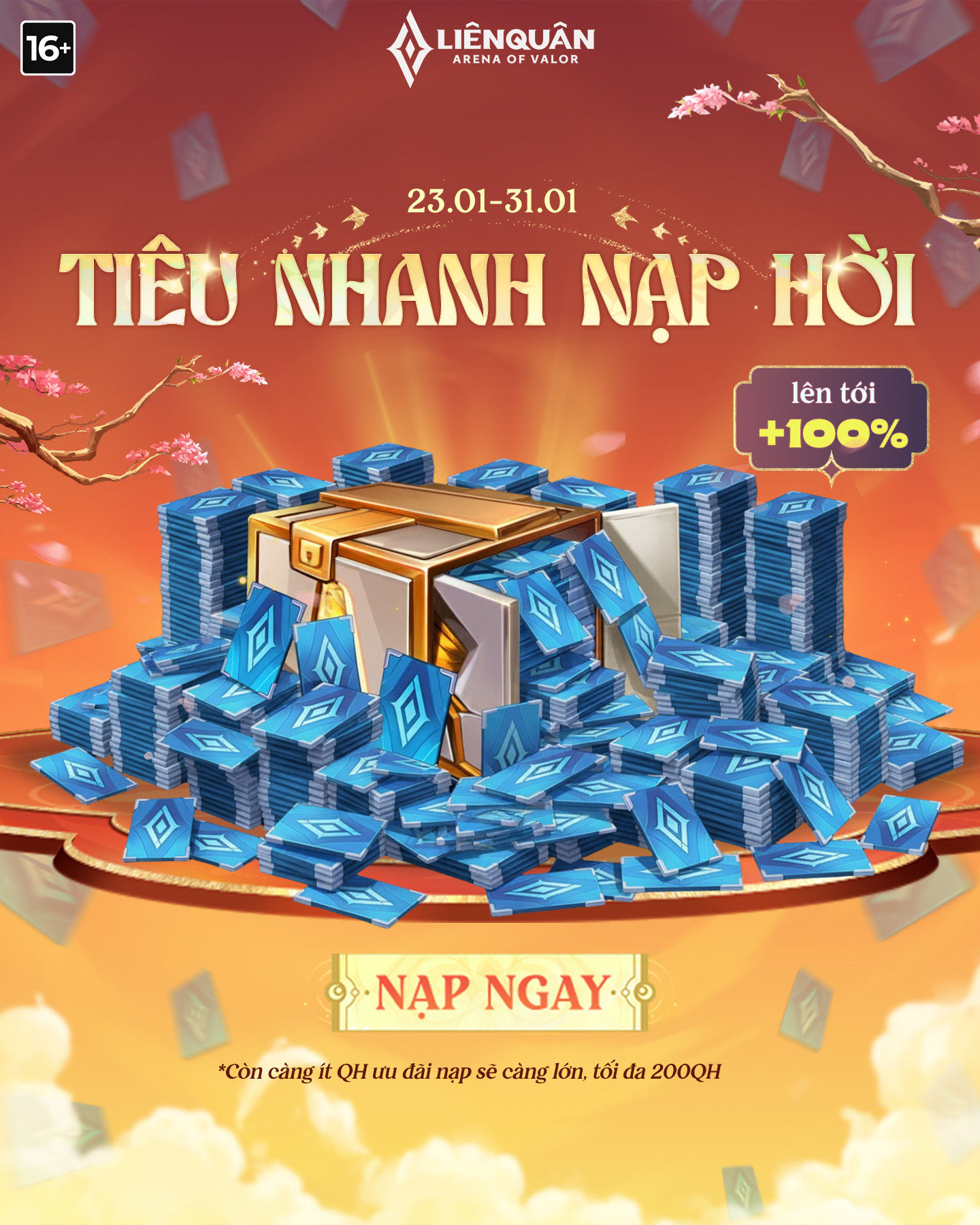 Sự kiện diễn ra từ 23.01 – 31.01 với quy tắc: Bạn còn càng ít Quân huy trong tài khoản, khuyến mãi nạp càng lớn! Chi tiết xem tại đây
